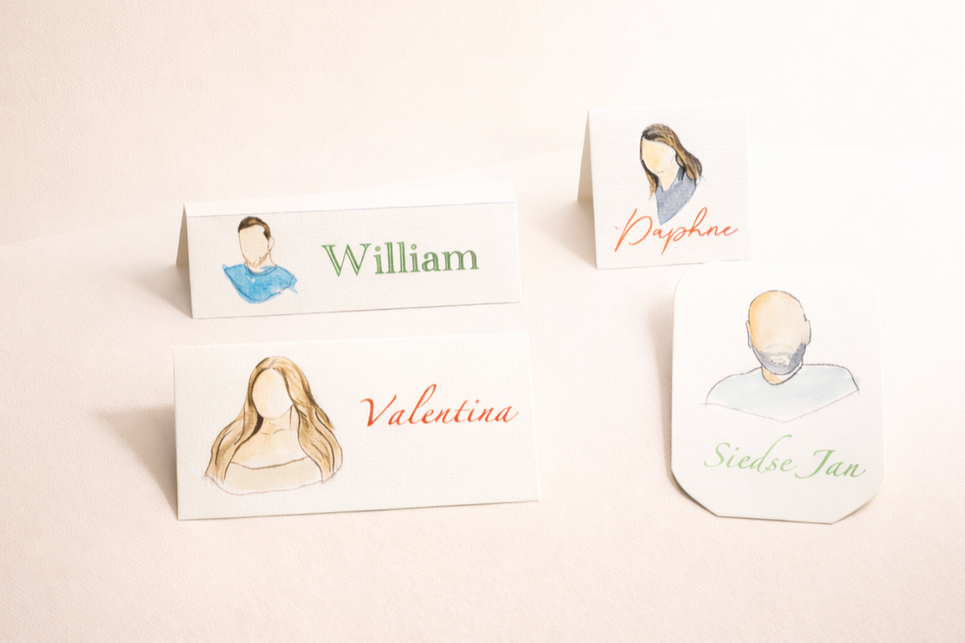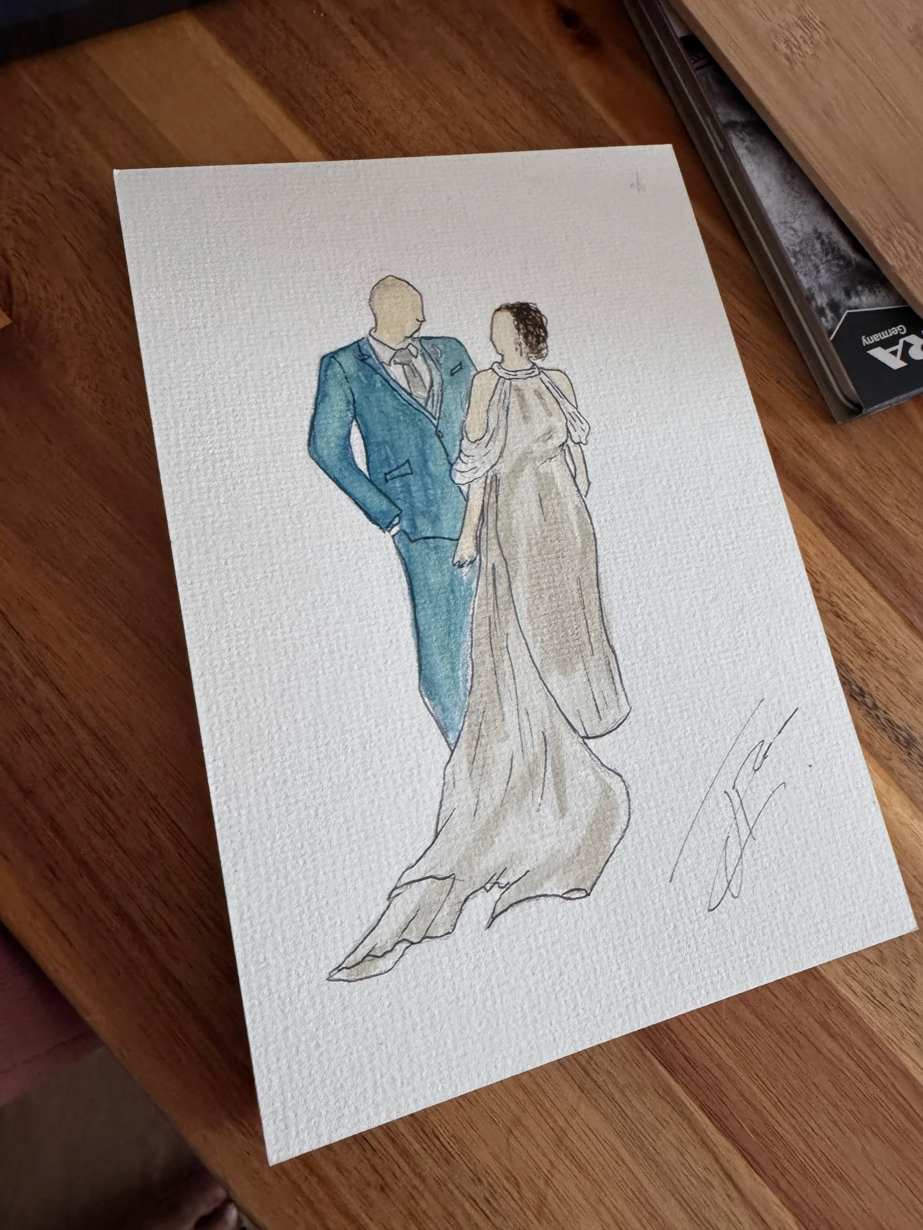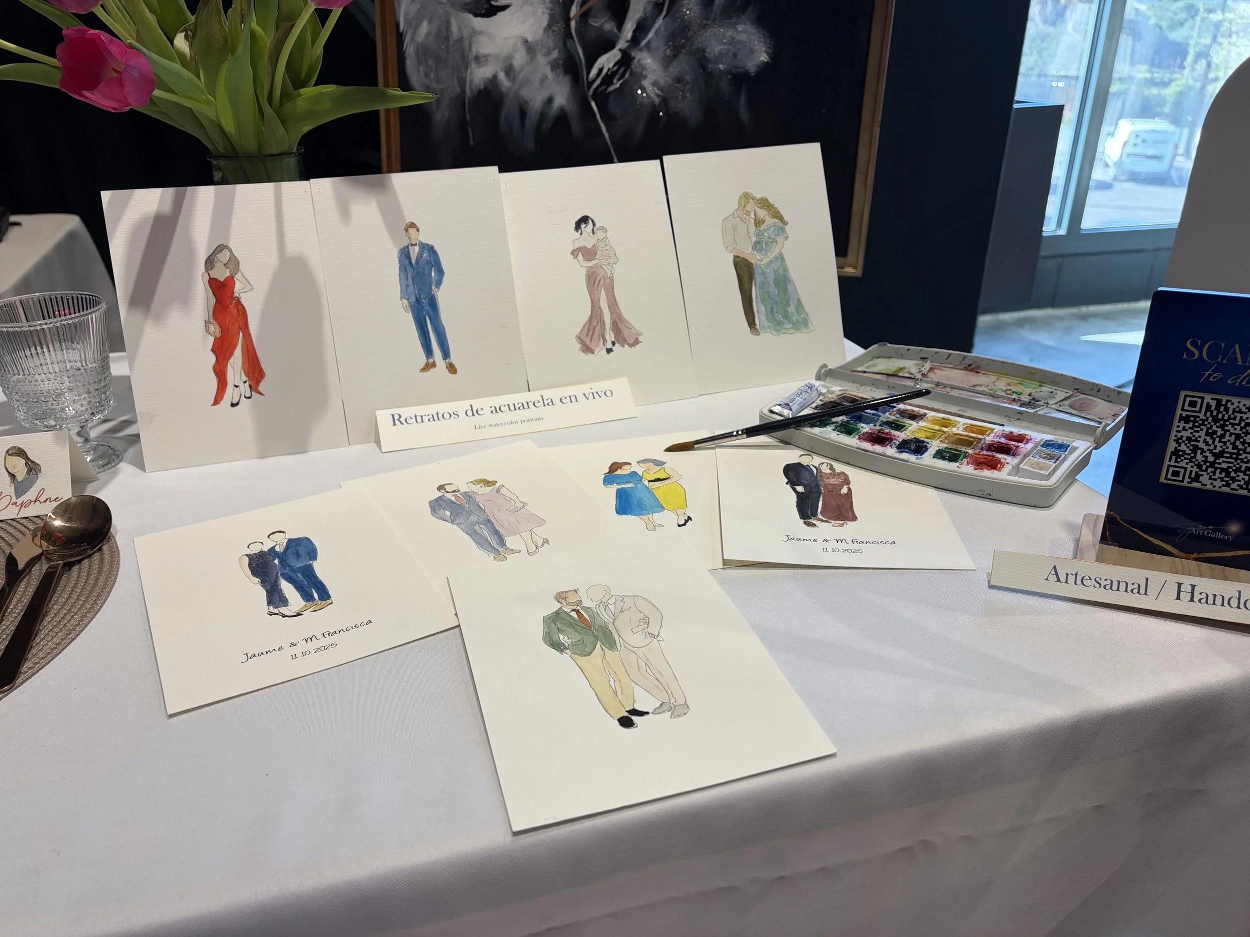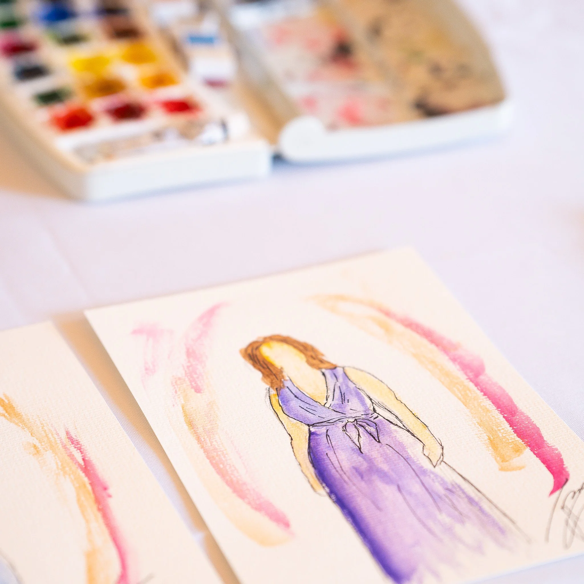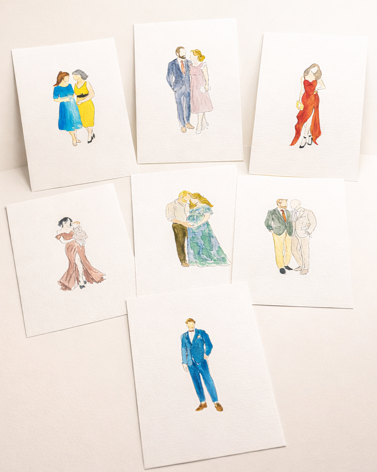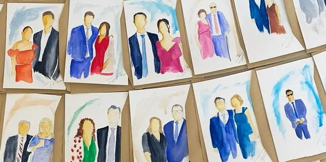 Up to 50 guests can be painted on-site, with additional portraits completed in the studio and delivered in elegant envelopes after the wedding.