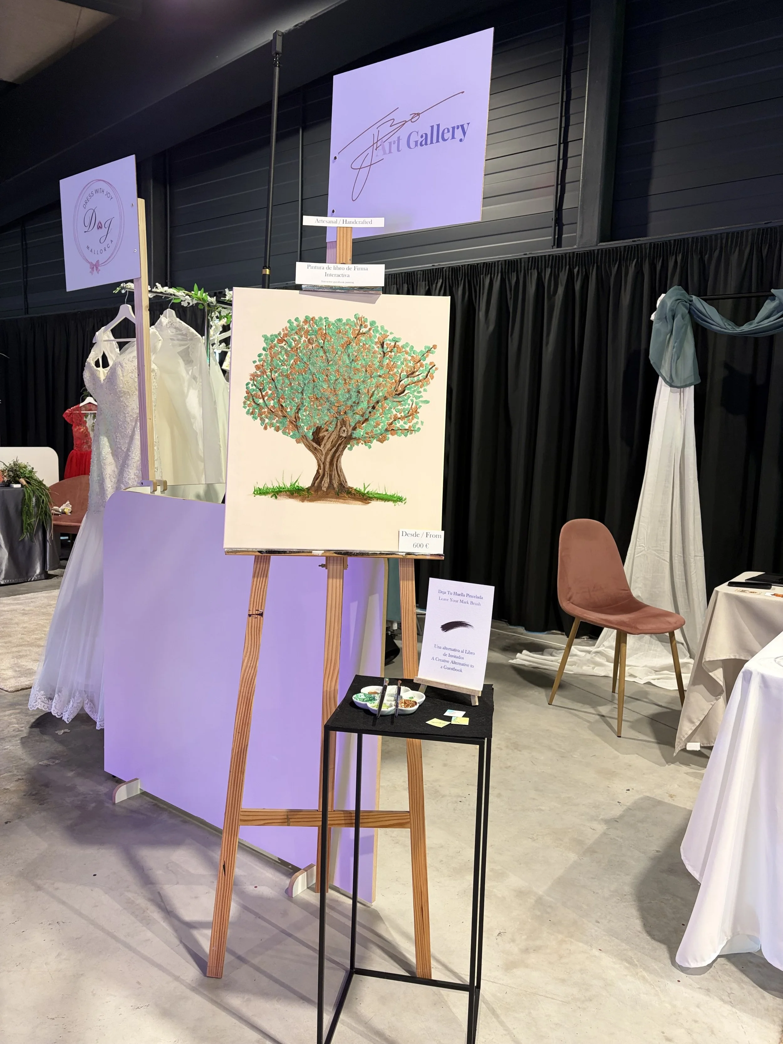 50 x 60 cm canvas, all paint materials, custom base design, guided participation during the event (max 3 hours), professional studio finishing, framed delivery approximately one month after the wedding, timelapse video, and a certificate of authenticity.